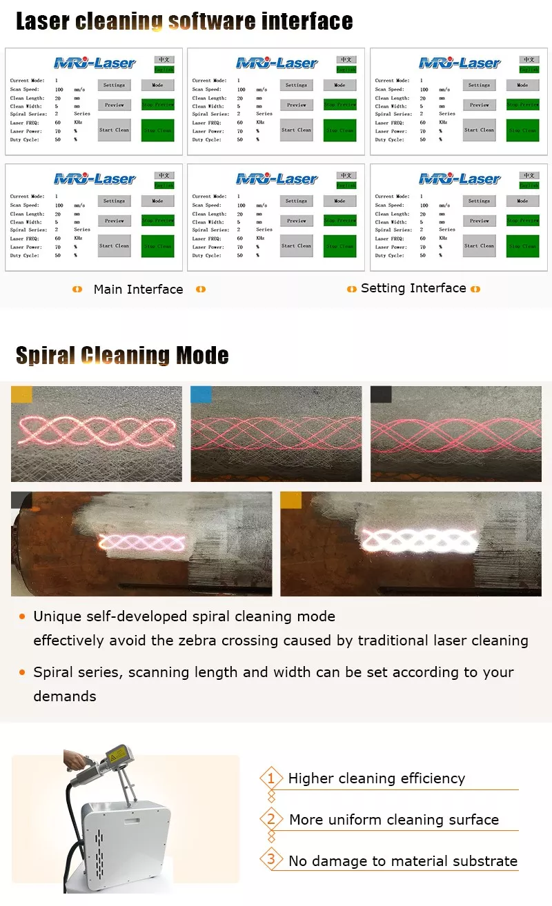 - Software de control y láser de diseño propio e integrado con 10 modos de limpieza en espiral, más uniformes y eficientes.